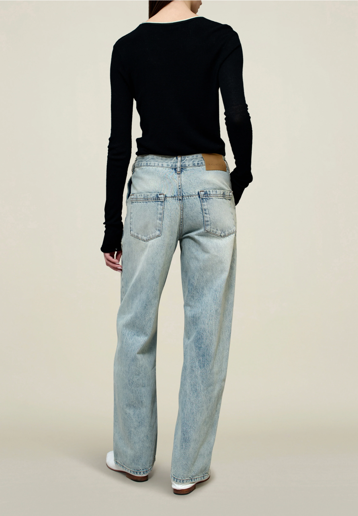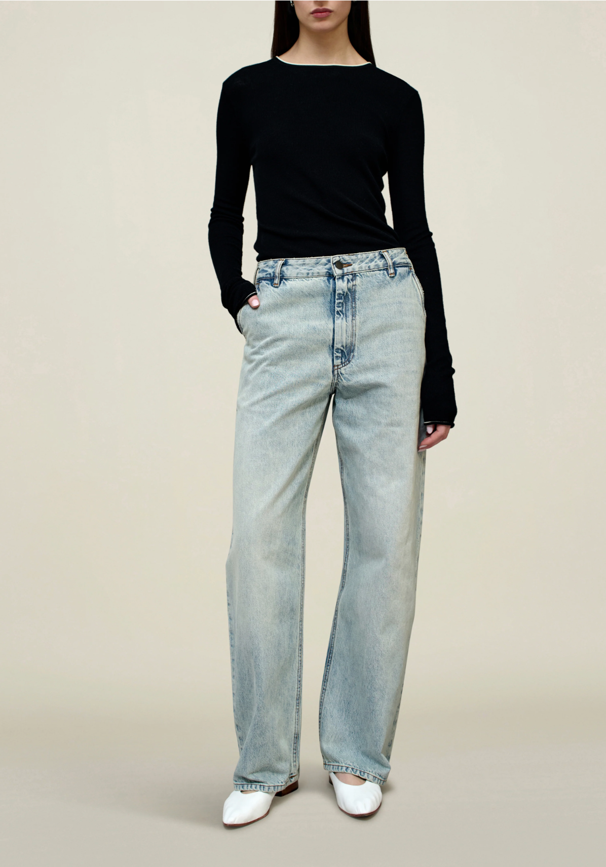 The Wide Leg Column Jean in new perfectly washed Acid Fadeout. Mid-high rise. Roomy through hip and thigh. Long wide leg with subtle sculptural curve. 28” inseam. Deep side seam pockets and back pockets. Belt loops. True to size. Leather logo patch. Expect cotton to loosen after wear. Fits relaxed or true to size.