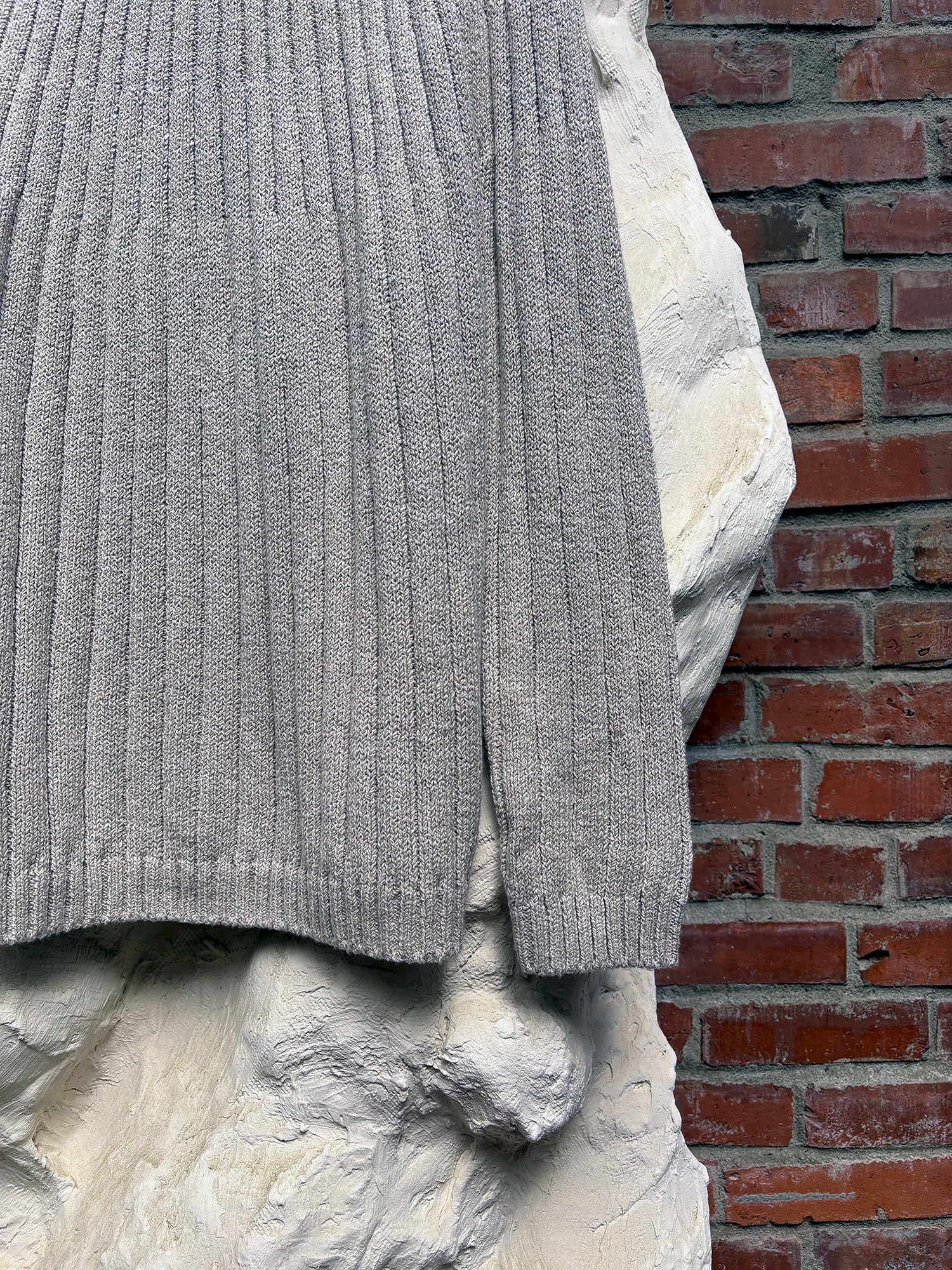 A slub cotton, all-season roll neck sweater. It features a radial knit pattern at the neck that drapes over the shoulders into long, exaggerated sleeves. The textured, breathable, drapey cotton slub yarn offers a relaxed, roomy fit that reaches hip length.
