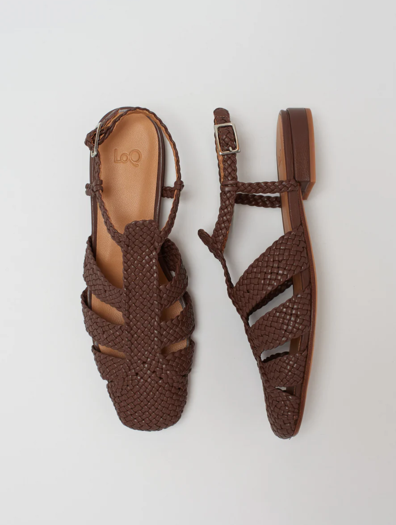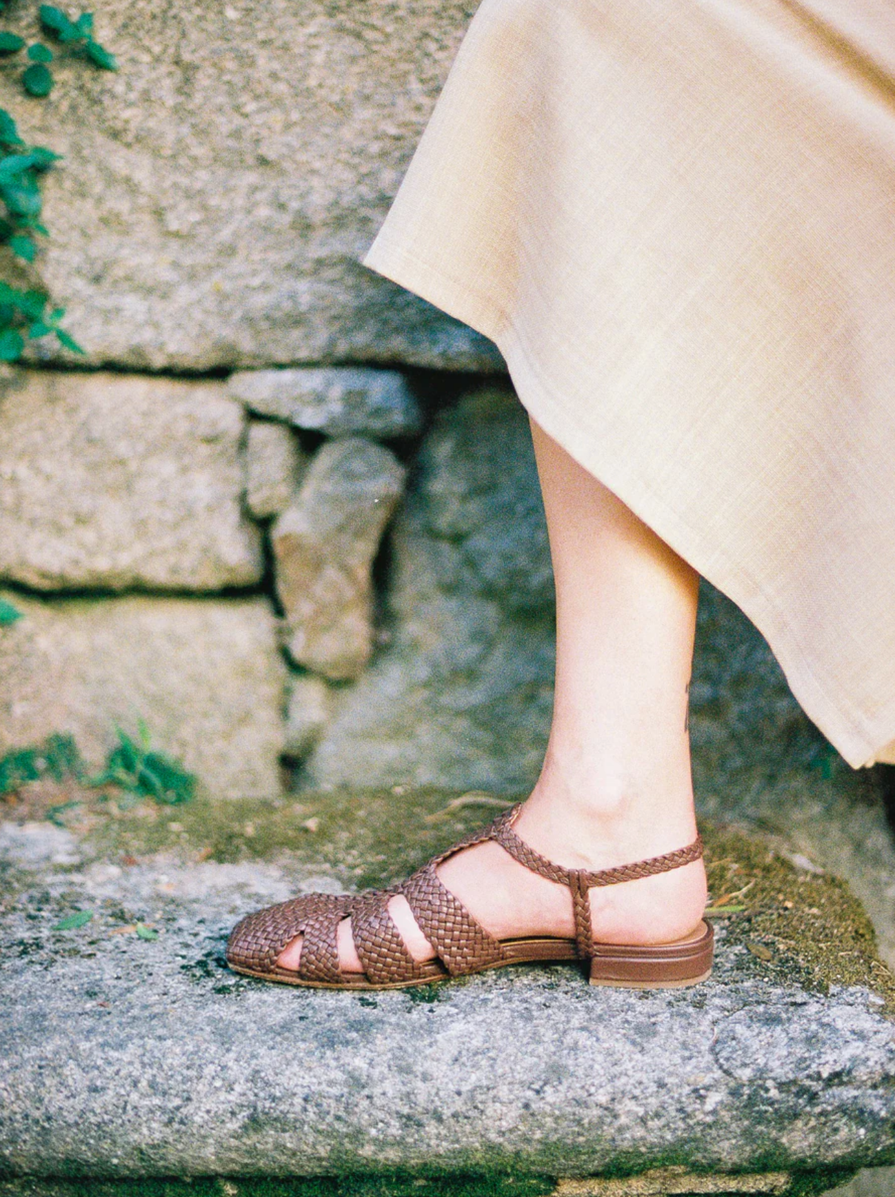 Made in Spain, the Arlo is an updated Fisherman sandal featuring a buckle closure and three straps across the foot in woven brown leather.