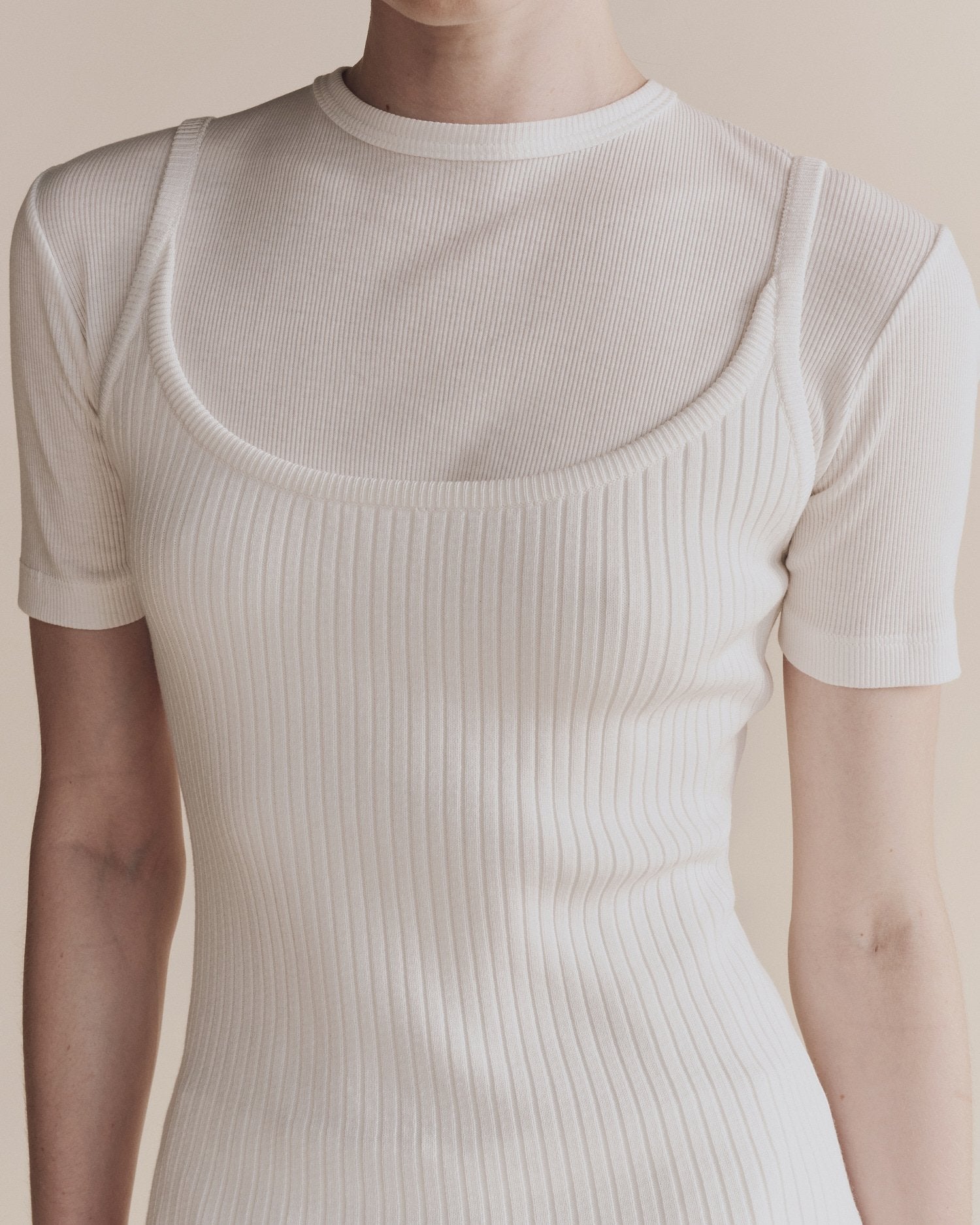 - Scoop neck, fitted rib knit tank top.